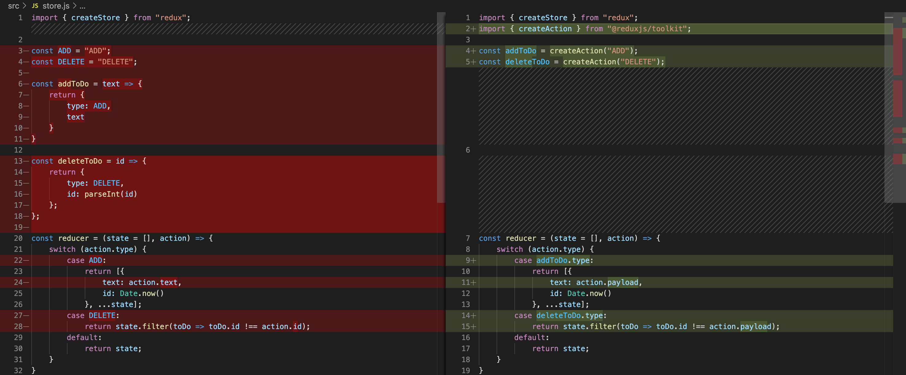reducer에 Action을 보낼 때 직접 action Object를 정의해서 보내주던 과정을 createAction을 사용해서 정해진 형태로 바꿀 수 있다.