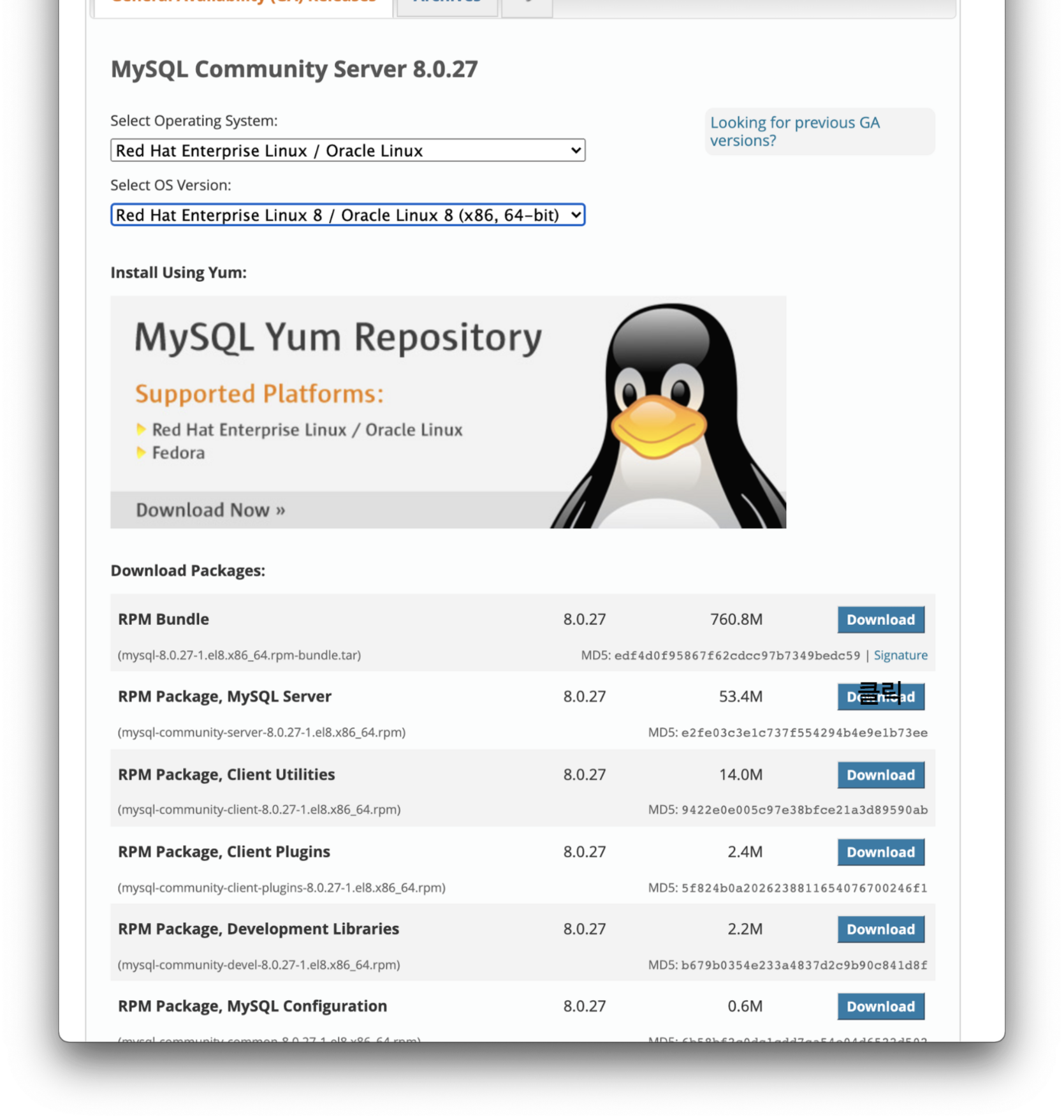 먼저 MySQL Server 다운로드 사이트로 이동하여 본인의 OS와 버전에 맞는 레포지토리를 찾는다.